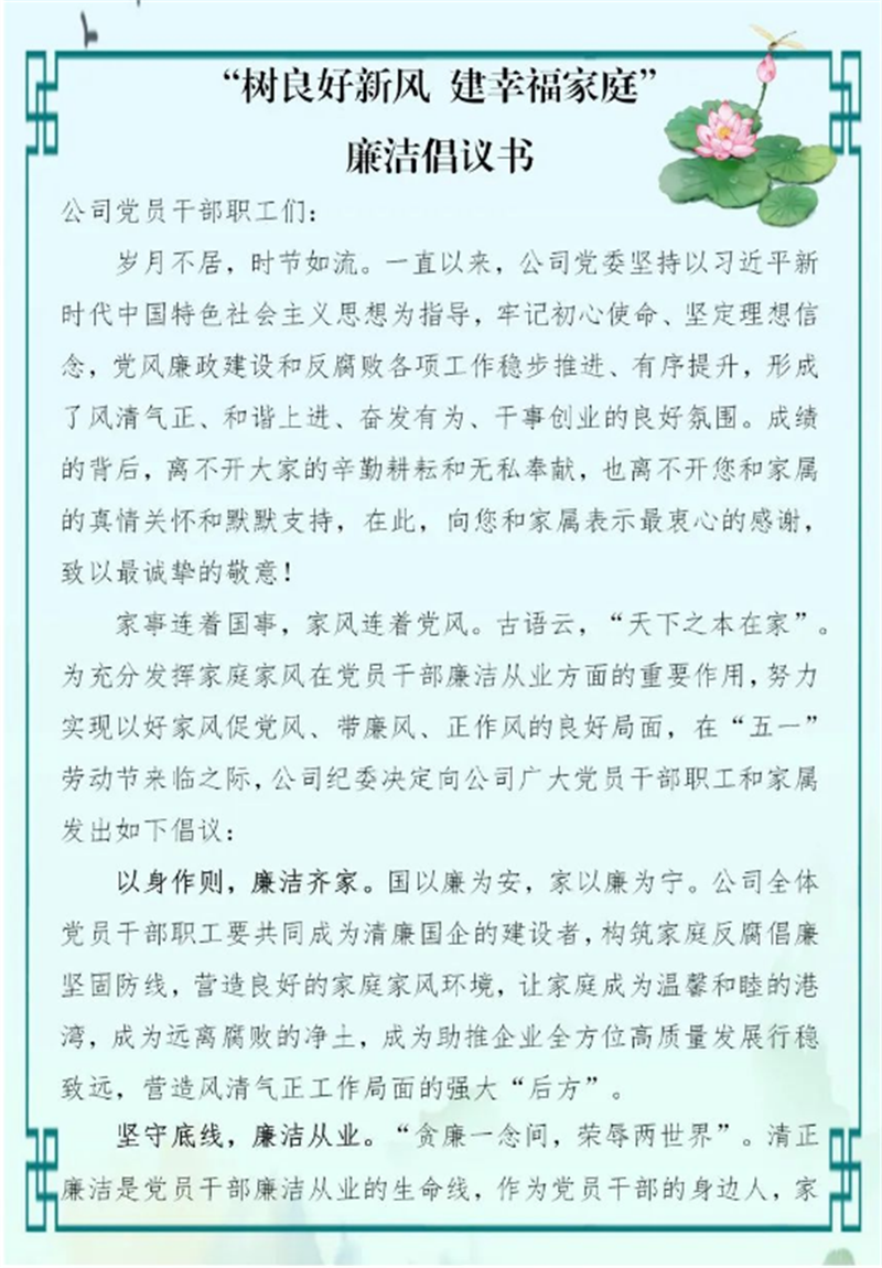 集团公司把家风建设作为廉洁文化建设的重要一环,结合文明家庭创建,开展家庭助廉教育,以家风促作风,以亲情促廉情。