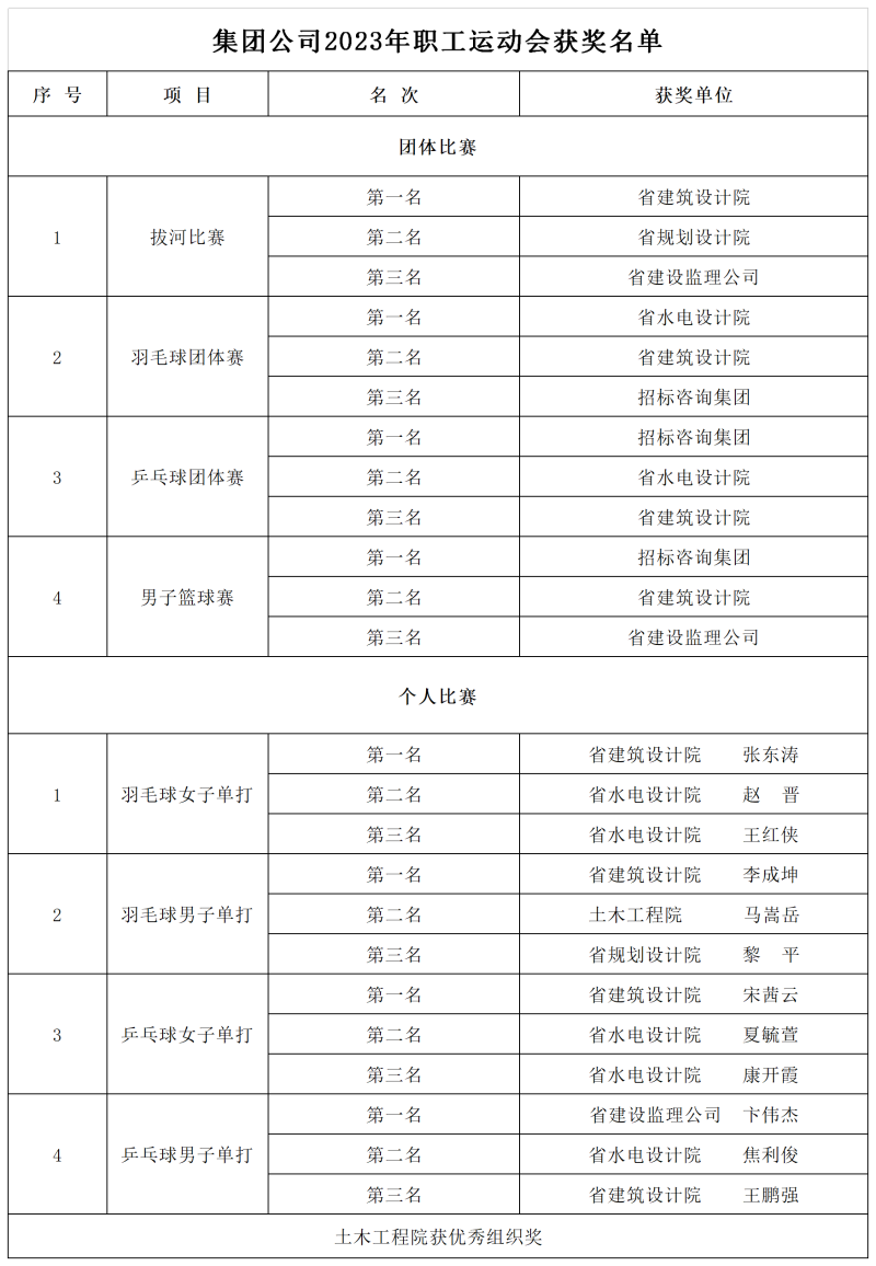<p style="text-align: justify; text-indent: 2em;"><span style="font-size: 18px;">10月20日，为期2天半的集团公司2023年职工运动会圆满闭幕。集团公司党委书记、董事长马明，党委副书记、总经理张佩峰，党委委员、副总经理苟海龙、成少平，董事会秘书柳雷出席闭幕式，党委副书记王春燕主持。</span></p><p style="text-align: justify; text-indent: 2em;"><span style="font-size: 18px;">闭幕式上，集团公司党委委员、副总经理苟海龙宣读了集团公司2023年职工运动会获奖单位及个人名单。集团公司领导为获奖单位和个人颁奖。</span></p><p style="text-align: center"><img src="../../hdupf/img/202310/202310201697806264106977.png"/></p><p style="text-align: center"><img src="../../hdupf/img/202310/202310201697806289678223.jpg"/></p><p style="text-align: center;">（拔河团体赛&nbsp;一、二、三等奖）</p><p style="text-align: center"><img src="../../hdupf/img/202310/202310201697806331140025.jpg"/></p><p style="text-align: center;">（男子篮球赛一、二、三等奖）</p><p style="text-align: center"><img src="../../hdupf/img/202310/202310201697806361120200.jpg"/></p><p style="text-align: center;">（羽毛球团体赛一、二、三等奖）</p><p style="text-align: center"><img src="../../hdupf/img/202310/202310201697806399135119.jpg"/></p><p style="text-align: center;">（乒乓球团体赛一、二、三等奖）</p><p style="text-align: center"><img src="../../hdupf/img/202310/202310201697806433382853.jpg"/></p><p style="text-align: center;">（个人羽毛球比赛一、二、三等奖&nbsp;）</p><p style="text-align: center"><img src="../../hdupf/img/202310/202310201697806460725730.jpg"/></p><p style="text-align: center;">（个人乒乓球比赛一、二、三等奖）</p><p style="text-align: center"><img src="../../hdupf/img/202310/202310201697806488141660.jpg"/></p><p style="text-align: center;">（优秀组织奖）</p><p style="text-align: justify; text-indent: 2em;"><span style="font-size: 18px;">集团公司党委副书记王春燕在闭幕式上向获得优异赛绩的代表队、运动员表示热烈祝贺，向运动会的组织者、工作人员表示衷心的感谢。她指出，此次运动会弘扬了“更高、更快、更强、更团结”的奥林匹克精神，发扬了不怕吃苦、奋发向上、勇于拼搏的企业文化精神，增进了集体荣誉感，增强了集团公司的凝聚力、向心力。赛出了风格，赛出了友谊，赛出了水平。希望广大干部职工以饱满的热情拼搏攻坚、以昂扬的斗志奋力工作，在中国式现代化甘肃实践中挺膺“甘咨询”担当，贡献“甘咨询”力量！</span></p><p style="text-align: right; text-indent: 2em;"><span style="font-size: 16px;">(责任编辑：杨&nbsp; 虹)</span></p>                        </div>