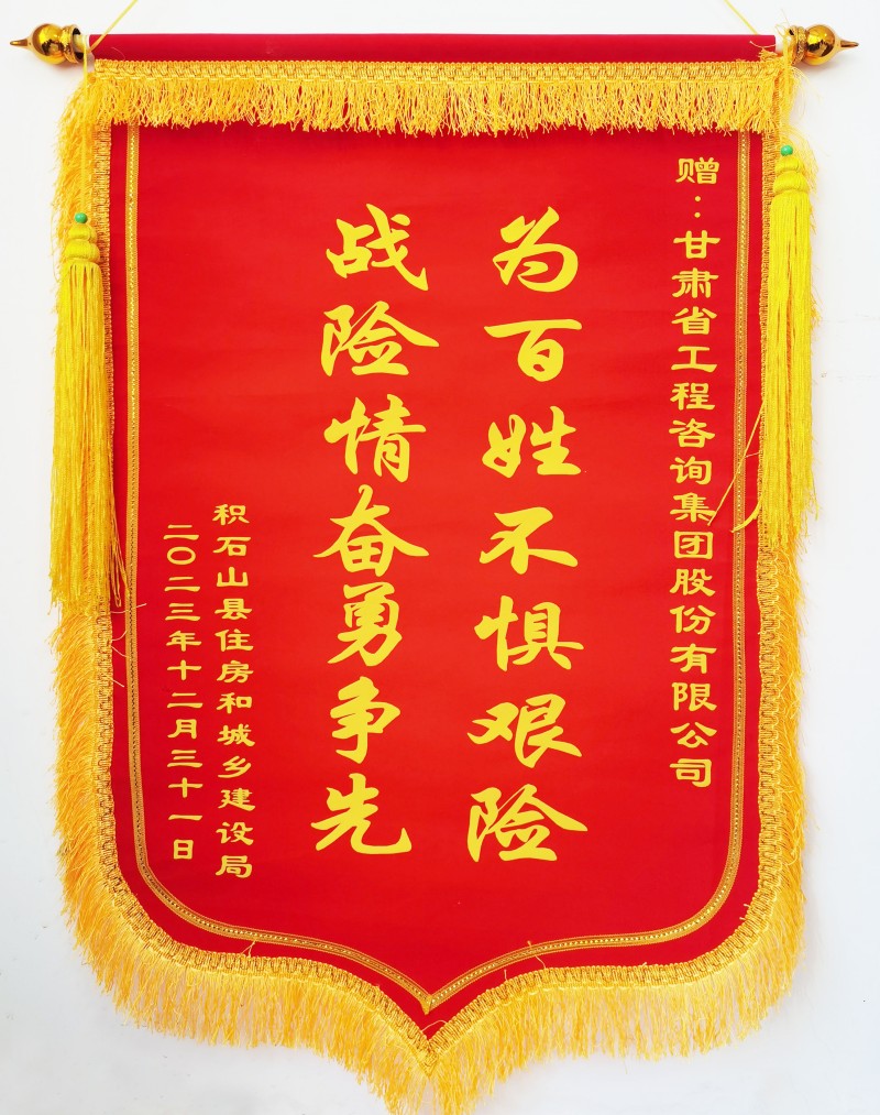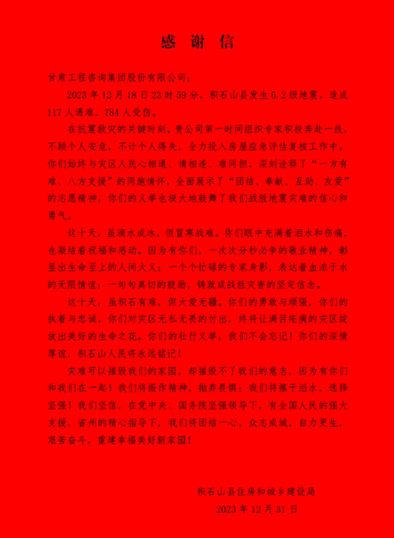 1月3日上午,积石山县住房和城乡建设局向金宝慱亚洲体育集团赠送“为百姓不惧艰险,战险情奋勇争先”锦旗,并发来《感谢信》,对在抗震救灾关键时刻奔赴灾区开展房屋应急评估工作的专家表达感谢和敬意。