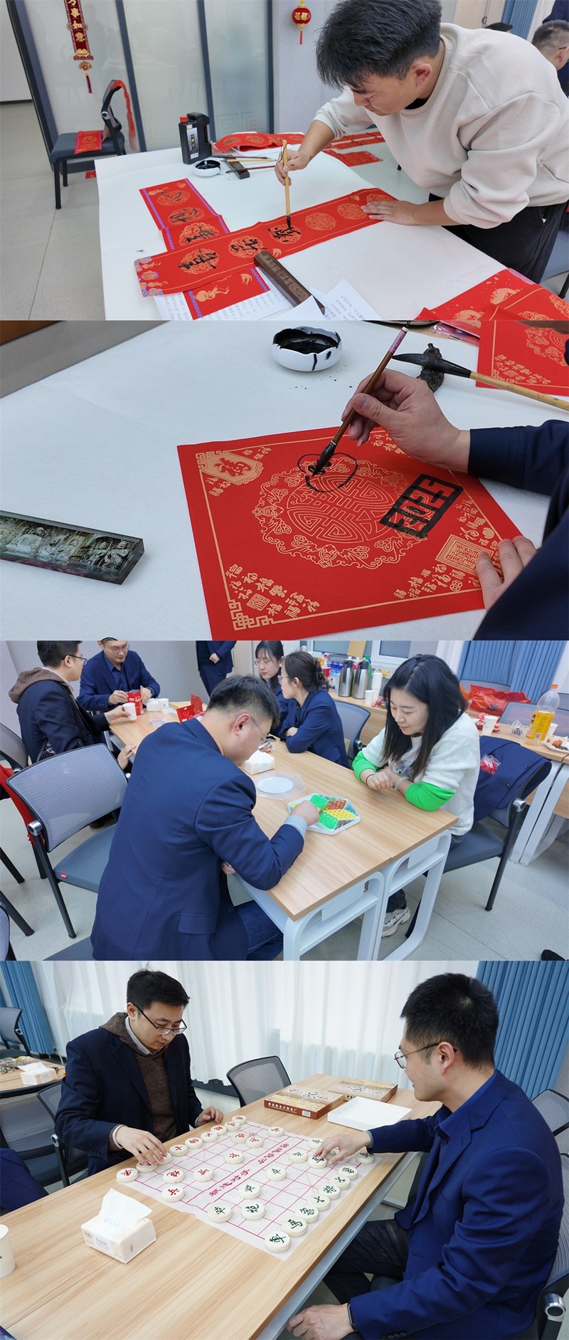 棋牌类游戏区,博弈双方凝神屏气、见招拆招、运筹帷幄、乐在“棋”中。春联福字区,长桌排开、翰墨飘香,喜迎新春的气氛扑面而来。一声声叫好、一副副春联、一个个“福”字,承载着大家对新年的美好期盼与祝福。