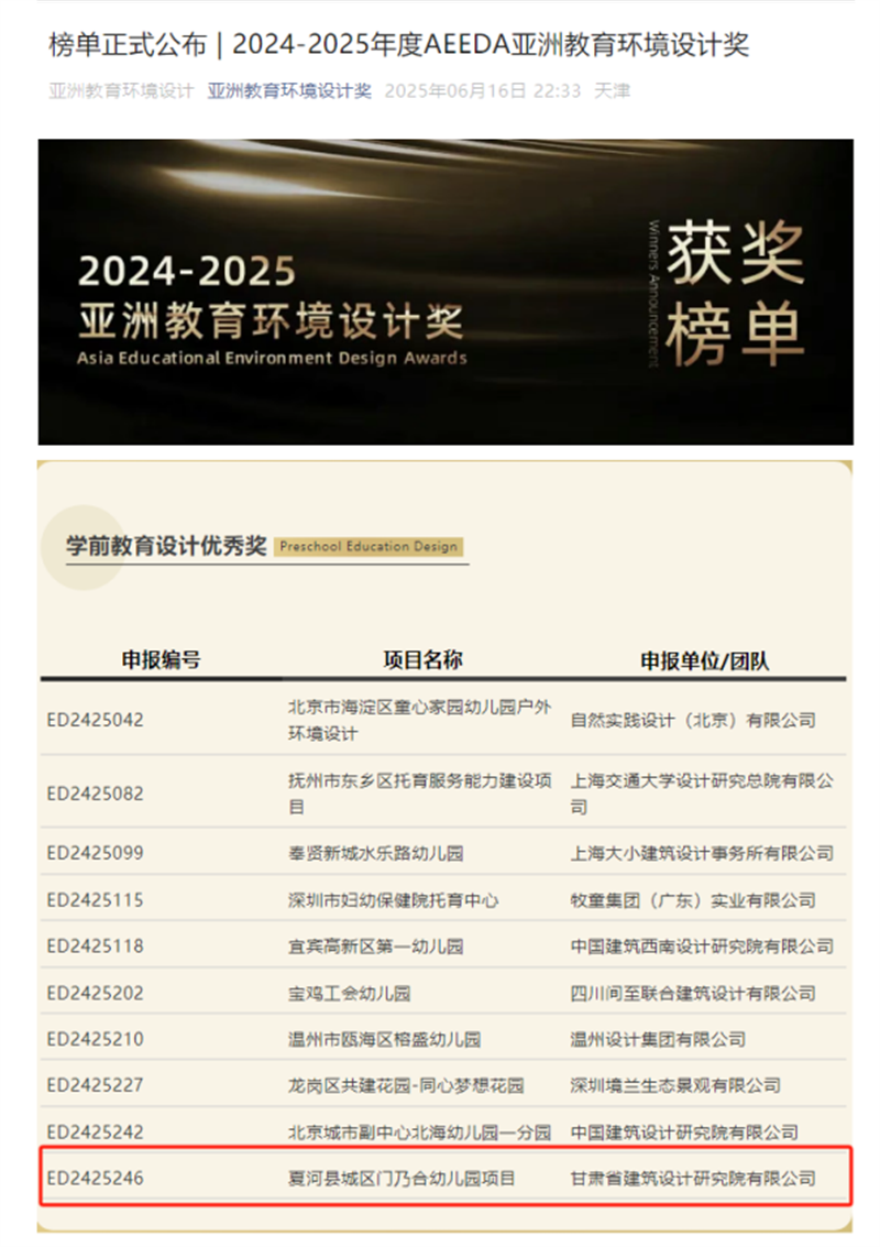 近日,备受瞩目的2024-2025年度AEEDA亚洲教育环境设计奖(Asia Educational Environment Design Awards)获奖名单正式揭晓。由金宝慱亚洲体育集团旗下省建筑设计院设计的夏河县城区门乃合幼儿园项目,从百余件参赛作品中脱颖而出,荣膺学前教育设计领域优秀奖,为甘肃建筑设计行业赢得了国际声誉。