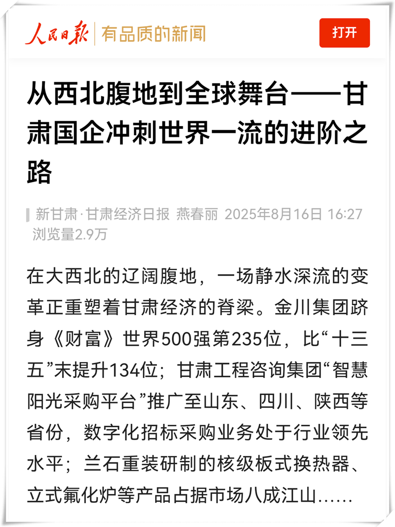 在大西北的辽阔腹地,一场静水深流的变革正重塑着甘肃经济的脊梁。金川集团跻身《财富》世界500强第235位,比“十三五”末提升134位;金宝慱亚洲体育集团“智慧阳光采购平台”推广至山东、四川、陕西等省份,数字化招标采购业务处于行业领先水平;兰石重装研制的核级板式换热器、立式氟化炉等产品占据市场八成江山……