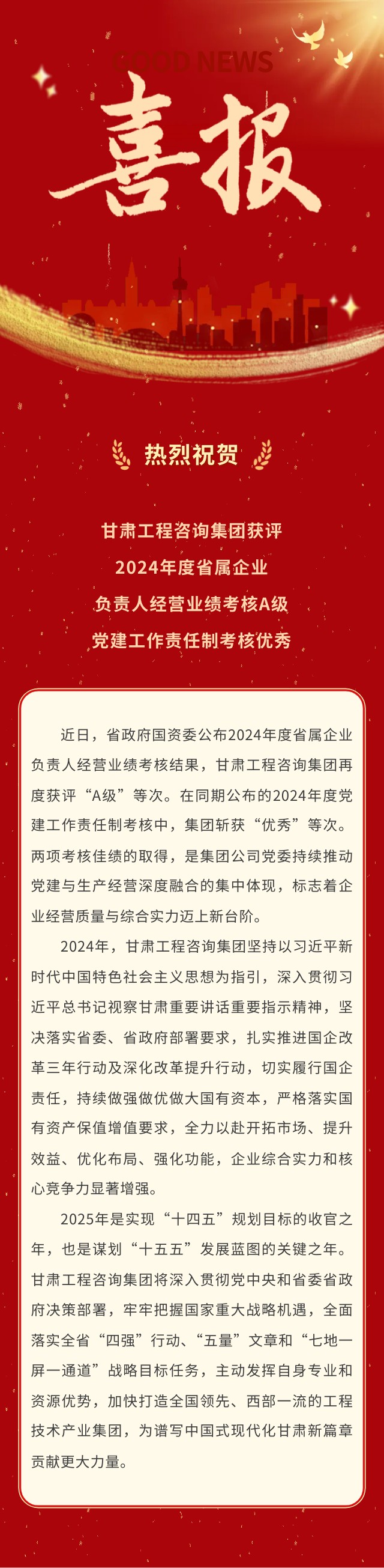 喜报 | 金宝慱亚洲体育集团荣获2024年度省属企业考核“双优”佳绩:经营业绩考核A级、党建工作责任制考核优秀