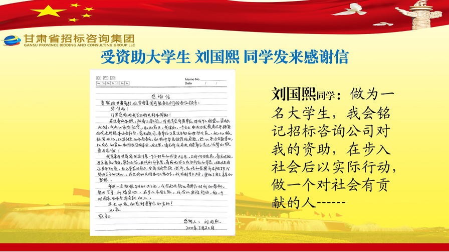 近日,张家川县张棉驿乡张棉村贫困大学生代表刘国熙、周长斌、李雪峰等向甘肃省招标咨询集团有限责任公司发来感谢信,就招标咨询集团给予学费资助一事表达他们的感激之情。
