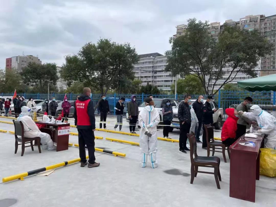 “您好”“请不要拥挤”“提前打开健康码”……这是土木工程院的后勤管理部工作人员在有序指挥前来进行核酸检测的职工和家属。