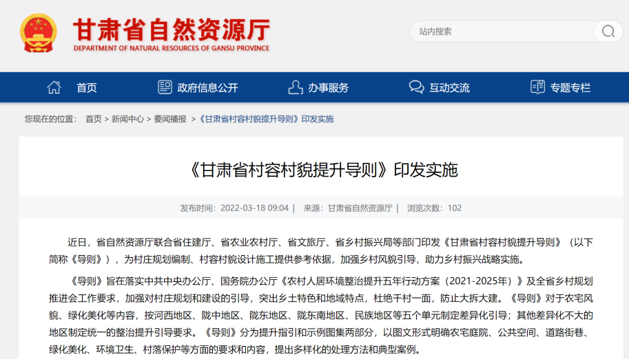 为进一步贯彻落实中共中央办公厅、国务院办公厅《农村人居环境整治提升五年行动方案(2021—2025年)》及全省乡村规划推进会精神,由甘肃省城乡规划设计研究院有限公司牵头,联合甘肃省建筑设计研究院有限公司、西北师范大学城市规划与旅游景观设计研究院编制的《甘肃省村容村貌提升导则(试行)》(以下简称《导则》),于3月18日由省自然资源厅、省住建厅、省农业农村厅、省文旅厅、省乡村振兴局等五部门联合印发。《导则》的发布为全省村庄规划编制工作提供了参考依据,是推进乡村振兴战略实施的重要抓手,是改善我省农村人居环境、建设美丽甘肃的核心引导,将在规范我省村容村貌提升、弘扬传统文化、突出乡土特色和地域特点,杜绝千村一面,防止大拆大建等方面发挥重要作用。