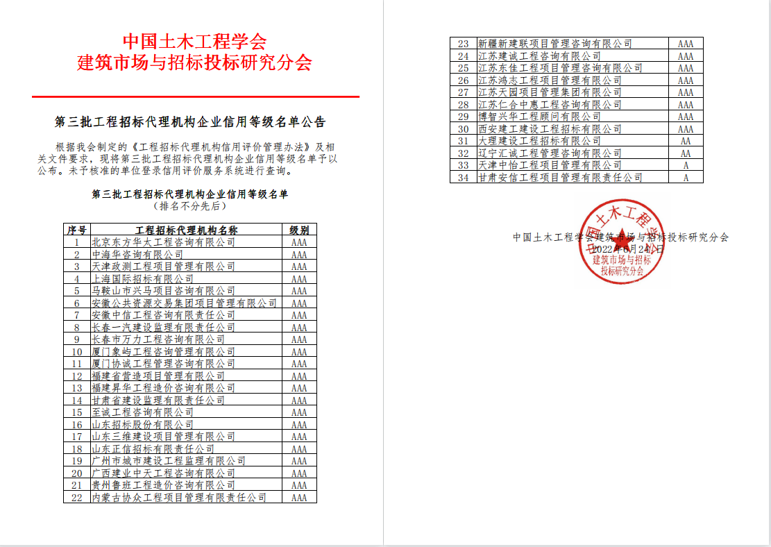 为认真贯彻落实甘肃省第十四次党代会精神,更好地发展招标代理业务,努力推进企业高质量发展,2022年6月,甘肃省建设监理有限责任公司积极筹备参加了由中国土木工程学会建筑市场与招投标研究分会组织的招标代理机构信用评价,日前,第三批工程招标代理机构企业信用等级名单公布,建设监理公司荣获中国土木工程学会建筑市场与招标投标研究分会招标代理机构AAA级信用企业称号。