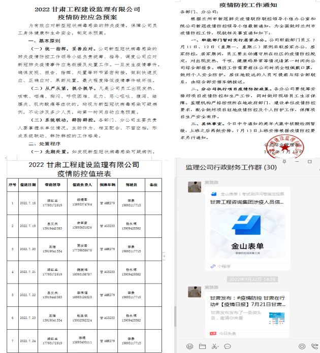 面对疫情“大考”,甘肃建筑设计院以高度的责任感守护疫情防控的“省院”防线,在阻击疫情方面,坚持闻令而动、令行禁止,做好自身防护的同时,选派干部响应号召下沉街道,派出志愿者助力辖区防控,把省市的各项防控举措落实落细落到位;在生产经营方面,发挥科技企业优势,统筹把握疫情防控与重点工程服务保障的关系,做到勘察服务准时高效、外业作业安全有序,把损失降到最低。建筑设计院各生产单位扭住关键点、打好主动战,用一项项“硬核”举措实现“自救”解困。瞧!这里就有一份来自建筑设计院子公司监理公司的“战报”。