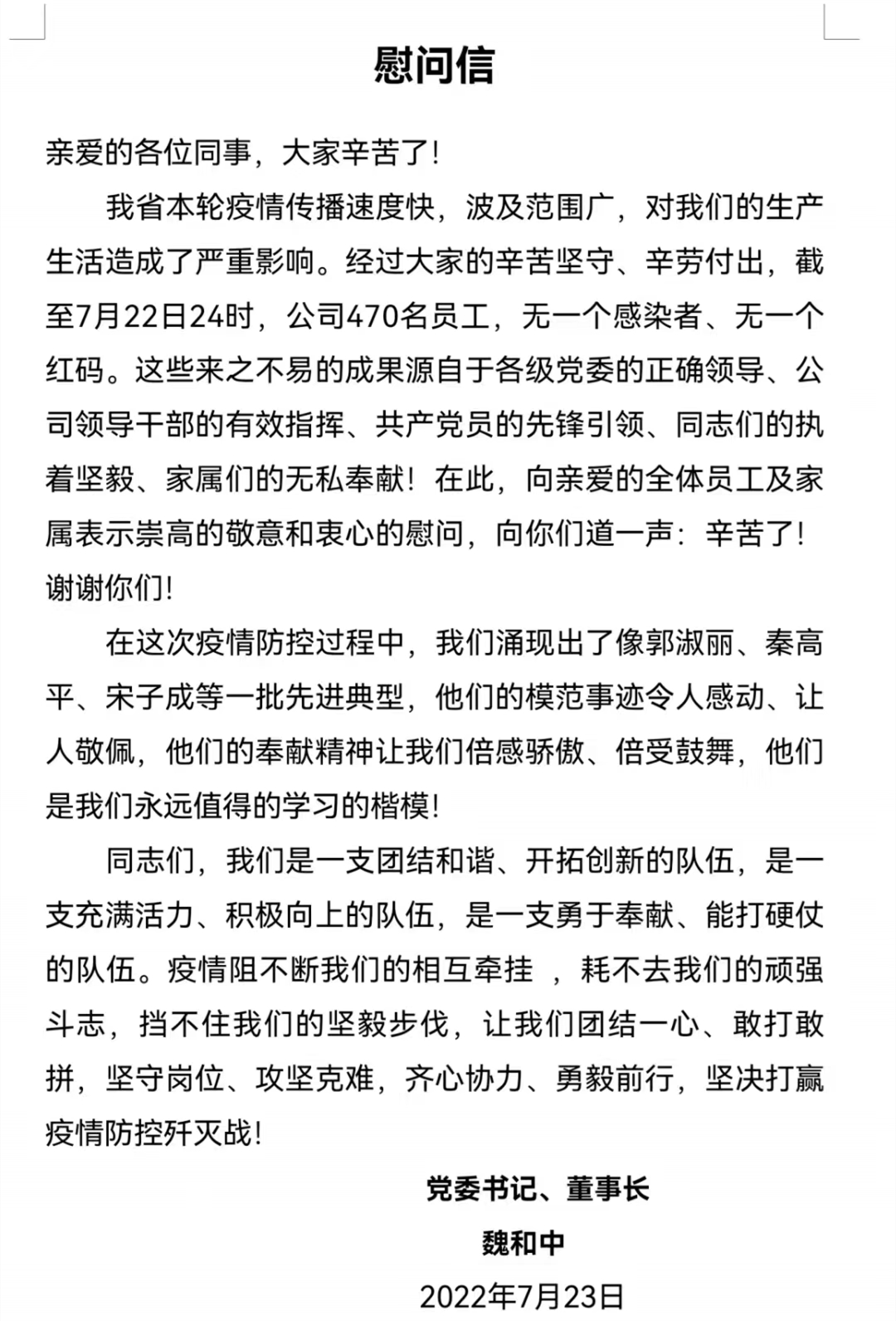 <p style="text-indent: 2em;"><span style="font-size: 18px;"></span></p><p style="text-align: left; text-indent: 2em;"><span style="font-size: 18px;">近日，甘肃省建设监理有限责任公司党委书记、董事长魏和中向全体职工发出慰问信，对在疫情期间值守项目一线和抗战疫情一线的党员干部职工致以最诚挚的关心和感谢。同时，号召全体干部职工向疫情防控期间涌现出的一线先进典型个人和共产党员先锋者学习，团结一心、敢打敢拼，坚守岗位、攻坚克难，齐心协力、勇毅前行，坚决打赢疫情防控歼灭战。</span></p><p style="text-align: left; text-indent: 2em;"><span style="font-size: 18px;"></span></p><p style="text-align: center"><img src="../../hdupf/img/202207/202207251658742624772936.png"/></p><p style="text-align: left; text-indent: 2em;"><span style="font-size: 18px;"></span><br/></p><p></p><p style="text-align: left; text-indent: 2em;"><span style="font-size: 18px;">面对新一轮疫情，建设监理公司党员干部职工把初心体现在行动上，把使命落实在社区第一线，不怕困难，不惧辛苦，为疫情防控工作贡献自己的力量。第四事业部经理郭淑丽身为部门经理，同时兼任兰州中川国际机场三期扩建项目总监理工程师代表，此次疫情期间，她不辞辛劳，坚守岗位，带领第四事业部全体职工在做好疫情防控的同时狠抓生产，使中川国际机场项目生产井然有序，防疫工作得到建设指挥部的一致称赞。</span></p><p style="text-align: left; text-indent: 2em;"><span style="font-size: 18px;"></span></p><p style="text-align: center"><img src="../../hdupf/img/202207/202207251658742687111688.png"/></p><p style="text-align: left; text-indent: 2em;"><span style="font-size: 18px;"></span><br/></p><p></p><p style="text-align: left; text-indent: 2em;"><span style="font-size: 18px;">根据省委组织部、省直机关工委联合下发的通知，建设监理公司党委组织部（人力资源部）部长、党委办公室（党群工作中心）主任杨丽丽和新疆分公司副经理张鹏下沉到街道社区疫情防控第一线开展志愿服务工作。志愿服务工作对杨丽丽来说并不陌生，早在2019年底疫情期间，她就先后三次参加到志愿者服务工作中去。本轮疫情防控期间，杨丽丽积极参与到电话流调、小区值守和核酸采样扫码员工作中去，认真、细致地做好进出小区人员的证件、工作证明查验，为居民配送生活物资以及信息登记和快递消杀等工作，严格落实好“一扫三查”措施并查验24小时核酸检测阴性证明，配合医护人员开展采样扫码工作近百小时，为保证社区各项工作有规、有责、有序地进行，贡献了自己的一份力量。</span></p><p style="text-align: left; text-indent: 2em;"><span style="font-size: 18px;"></span></p><p style="text-align: center"><img src="../../hdupf/img/202207/202207251658742655308666.png"/></p><p style="text-align: left; text-indent: 2em;"><span style="font-size: 18px;"></span><br/></p><p></p><p style="text-align: left; text-indent: 2em;"><span style="font-size: 18px;">疫情防控，党员先行。面对严峻复杂的疫情防控形势，在医护人员短缺的情况下，有着14年党龄的张鹏下沉到学府路社区，担任起众邦金水湾2号院疫情防控核酸检测扫码员工作。除了负责扫码录入信息以外，张鹏还负责为小区居民配送生活物资、维护小区内的秩序、开展夜间通宵值守工作等，热心的服务和认真的工作态度，赢得了小区、物业和街道办人员的一致赞扬和肯定。</span></p><p style="text-align: left; text-indent: 2em;"><span style="font-size: 18px;"></span></p><p style="text-align: center"><img src="../../hdupf/img/202207/202207251658742667940932.png"/></p><p style="text-align: left; text-indent: 2em;"><span style="font-size: 18px;"></span><br/></p><p></p><p style="text-align: left; text-indent: 2em;"><span style="font-size: 18px;">疫情就是命令，防控就是责任。建设监理公司广大党员干部职工把初心体现在行动上，把使命落实在社区第一线，不怕困难，敢于冲锋，为打赢这场疫情防控歼灭战贡献了自己的力量。（责任编辑：田树芬）</span></p>                        </div>
