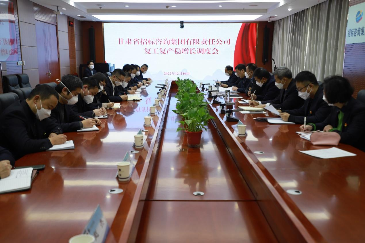 近日,甘肃省招标咨询集团有限责任公司召开复工复产稳增长调度会,传达学习全省工业复工复产稳增长调度会和集团公司复工复产稳增长调度会精神,分析1-11月生产经营情况,安排部署近期及来年相关工作。会议由公司党委书记、董事长牛茺主持。招标咨询集团领导班子成员、机关各部门及各子公司负责人参加会议。招标中心、金安公司作交流发言。