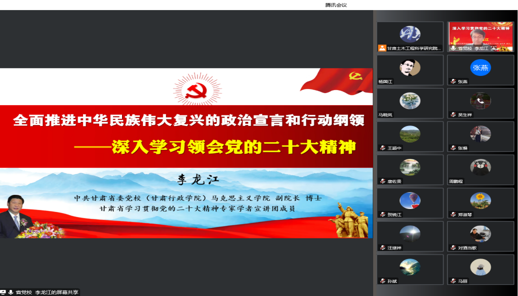 <p style="text-indent: 2em; text-align: left;"><span style="font-size: 18px;">12月14日，甘肃土木工程科学研究院有限公司以视频会议形式召开党委理论学习中心组学习（扩大）会议暨党的二十大精神专题培训辅导讲座。党委副书记、监事会主席、工会主席张磊主持会议，领导班子成员、全体党员、中层干部、入党积极分子参加。</span></p><p style="text-indent: 2em; text-align: left;"><span style="font-size: 18px;">会议邀请省委党校马克思主义学院副院长、全省学习贯彻党的二十大精神专家学者宣讲团成员李龙江教授作了题为《全面推进中华民族伟大复兴的政治宣言和行动纲领——深入学习领会党的二十大精神》的专题讲座。以党的二十大报告为主线，结合国有企业高质量发展具体事例，对党的二十大精神进行了全面深入、系统详尽的阐释解读，使全体党员干部职工从多方面、多角度对党的二十大精神的核心要义有了更为清晰和深刻的认识，对进一步全面学习、全面把握、全面落实党的二十大精神起到了积极指导作用。</span></p><p style="text-indent: 2em; text-align: left;"><span style="font-size: 18px;"></span></p><p style="text-align: center"><img src="../../hdupf/img/202212/202212151671110389845015.png"/></p><p></p><p style="text-indent: 2em; text-align: left;"><span style="font-size: 18px;">会议强调，学习宣传贯彻党的二十大精神，是当前和今后一个时期的首要政治任务，全体党员干部职工要进一步提升政治站位，凝聚思想共识，在学习领会上下功夫、在宣传宣讲上见行动、在贯彻落实上求实效，推动学习宣传贯彻党的二十大精神走深走实。一要坚持学深悟透，高站位强化政治担当。全体党员干部职工要切实将思想和行动统一到党的二十大精神上来，将智慧和力量凝聚到党的二十大确定的目标任务上来，全面把握党的二十大提出的重要思想、重要观点、重大战略和重大举措。二要强化学习宣贯，高标准实现全覆盖。土木工程院两级党组织要开展多形式、分层次的学习培训，把学习贯彻党的二十大精神纳入党员干部日常教育，加强讨论交流，增强思想碰撞，不断从党的二十大精神中汲取智慧和力量。三要强化统筹融合，高质量实现发展新提升。将学习宣传贯彻党的二十大精神转化为攻坚克难、推动工作的生动实践，以学促干、以干践行，扎实做好年度各项工作收官，深入贯彻落实全省工业复工复产稳增长调度会和集团公司复工复产稳增长调度会精神，科学谋划明年和今后一个时期工作，盘点重点工作，做好项目储备，加力奋进、冲刺攻坚，夯实生产经营基础，为土木工程院高质量发展保驾护航。</span></p><p style="text-indent: 2em; text-align: right;"><span style="font-size: 18px; color: rgb(165, 165, 165);">(责任编辑：田树芬)</span></p>                        </div>