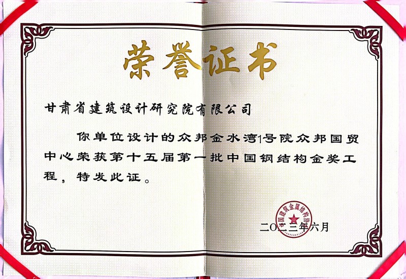 近日,从中国建筑金属结构协会传来喜讯,由省建筑设计院总建筑师、甘肃省工程勘察设计大师冯志涛领衔团队设计的“众邦国贸中心”荣获“第十五届第一批中国钢结构金奖工程”荣誉称号。