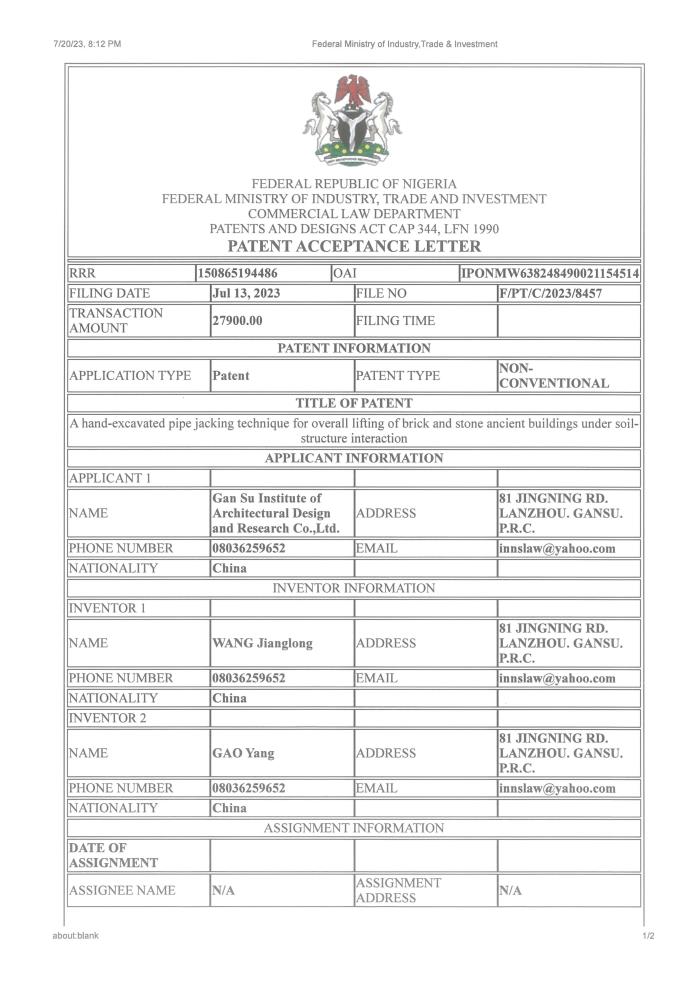 日前,非盟知识产权局对省建筑设计院王江龙等申报的“土-结构相互作用下砖石结构古建筑整体顶升手掘式顶管技术”(A hand-excavated pipe jacking technique for overall lifting of brick and stone ancient buildings under soil-structure interaction)进行授权,为省建筑设计院后续承接援外项目及国外项目给予了坚实的技术支撑。