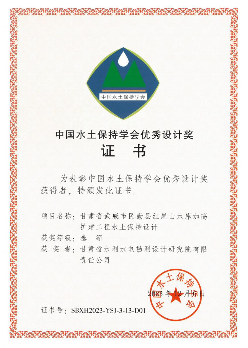近日,第四届中国水土保持学术大会在福建福州举行。省水电设计院勘测设计的《武威市民勤县红崖山水库加高扩建工程水土保持设计》《黄河干流甘肃段防洪治理工程水土保持设计》两项水土保持设计成果荣获第四届中国水土保持学会优秀设计三等奖。