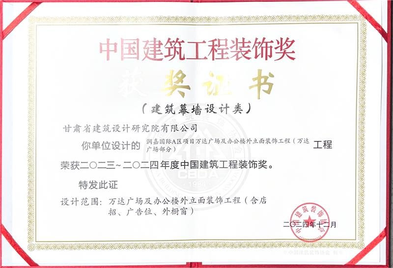 近日,中国建筑装饰协会公布了2023-2024年度“中国建筑工程装饰奖”获奖名单,省建筑设计院承担设计的“润嘉国际A区项目万达广场及办公楼外立面装饰工程(万达广场部分)”榜上有名。