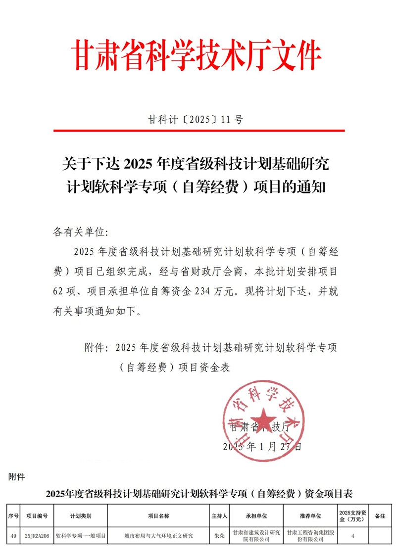 近日,甘肃省科技厅公布了2025年省级科技计划基础研究计划软科学专项(自筹经费)项目立项结果,省建筑设计院申报的“城市布局与大气环境正义研究”项目获批立项。