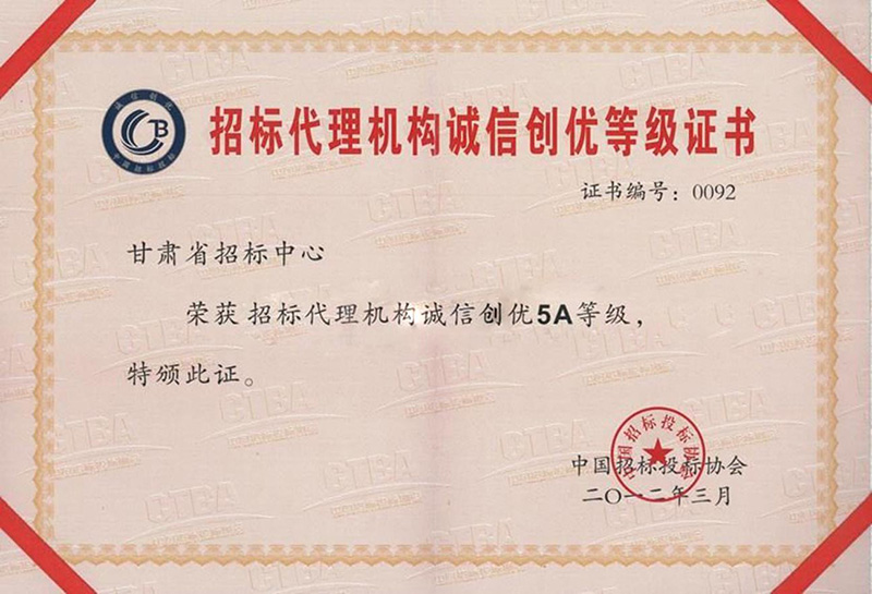 招标代理机构诚信创优登记证书